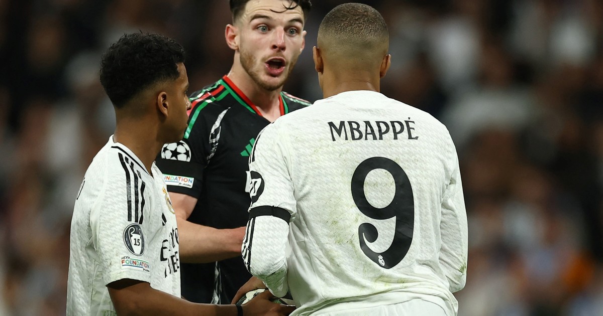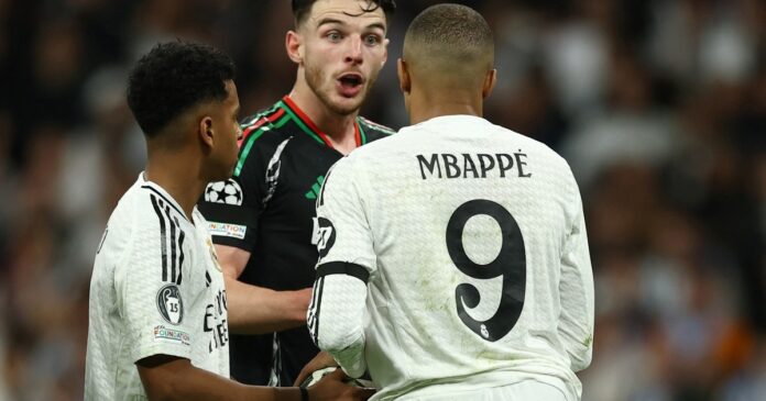 A los 22 minutos y 30 segundos del primer tiempo, el juez del encuentro cobró penal para el Real Madrid por una presunta falta de Declan Rice sobre Mbappé tras un centro de Lucas Vázquez que desvió Raúl Asensio. Claro, en la primera repetición ya parecía que el delantero se había tirado a la pelota y que el agarrón del inglés no fue de una fuerza digna de generar un obstáculo para detener la carrera de Kiki.