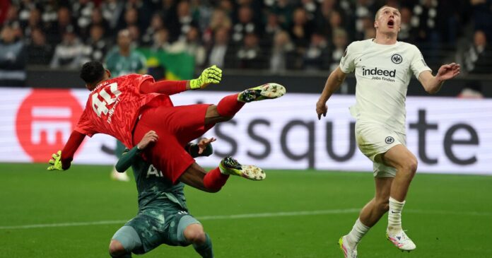 Kaua Santos, arquero de Eintracht Frankfurt, embiste a James Maddison de Tottenham Hotspur (REUTERS/Kai Pfaffenbach)