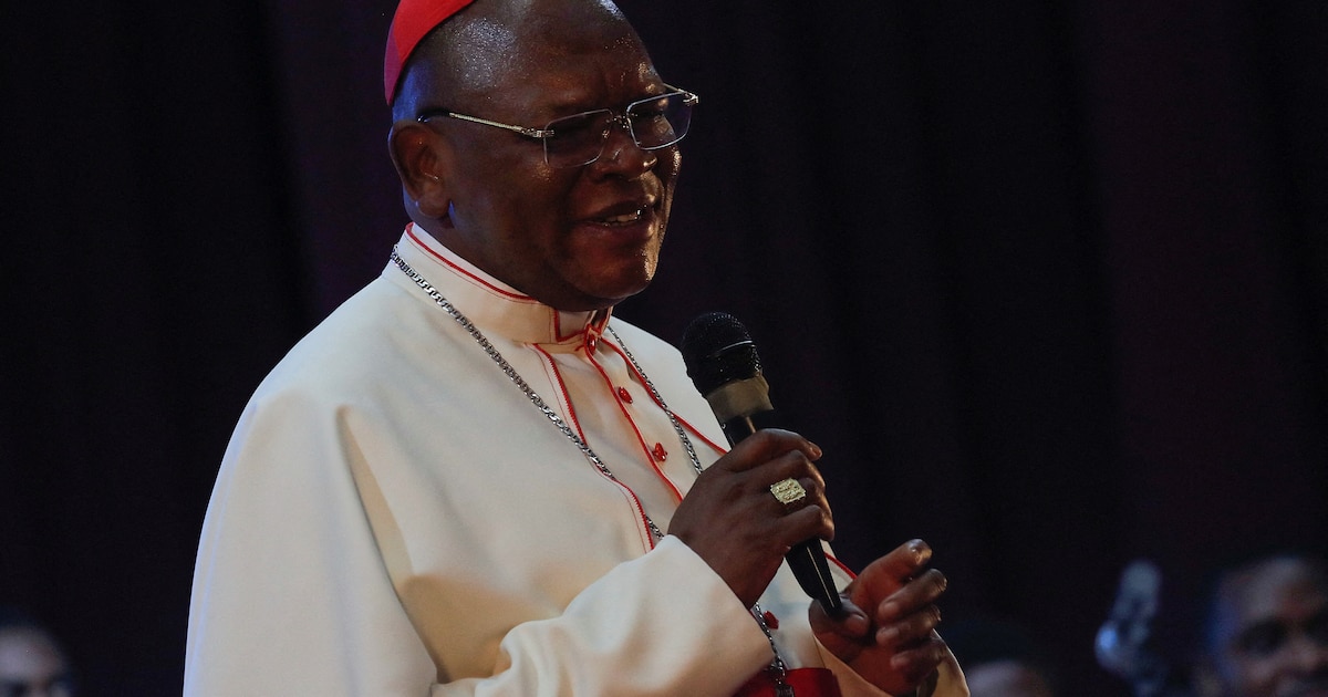 Fridolin Ambongo Besungu, cardenal de la República Democrática del Congo, habla durante un festival de música gospel organizado como parte de las festividades de la visita del Papa Francisco, en el teatro del parlamento en Kinshasa, República Democrática del Congo, el 29 de enero de 2023 (REUTERS/Luc Gnago)