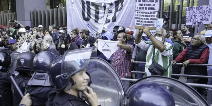 Además, detuvieron a los activistas sobre la vereda para garantizar el cumplimiento del protocolo antipiquetes, lo que generó gritos, insultos y empujones. También tiraron gas pimientas a los manifestantes.