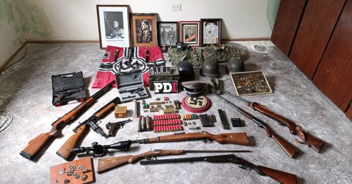 Los uniformados también secuestraron banderas con la esvástica, cascos de metal tipo militar, cuadros de Adolf Hitler y Benito Mussolini, prendas militares e insignias nazi.