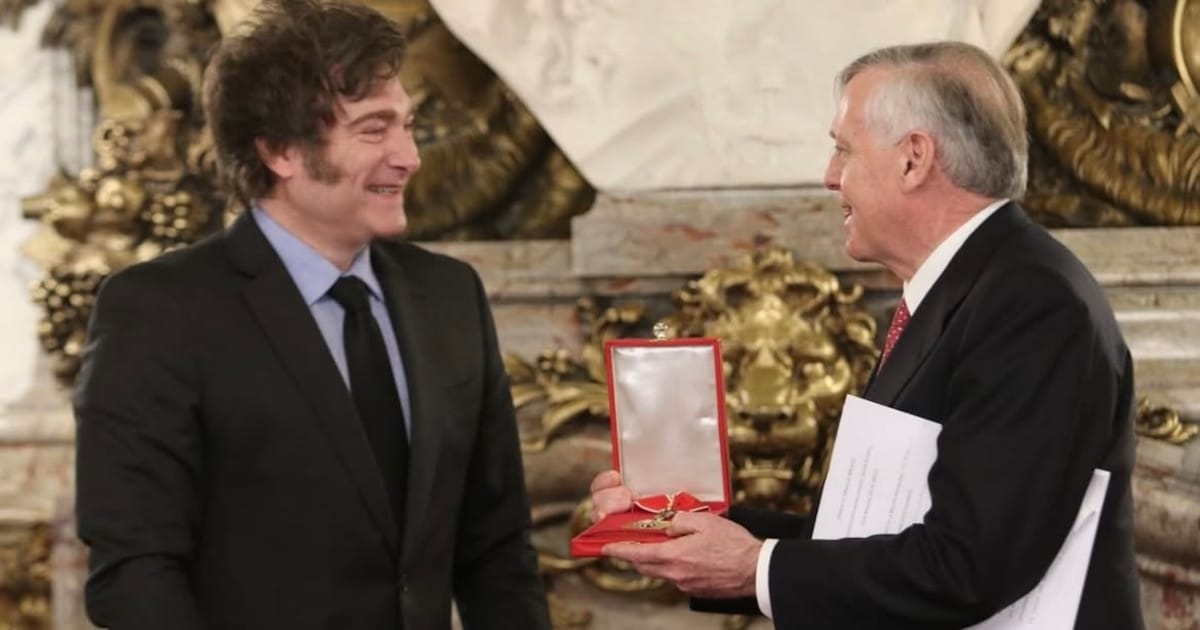 Milei y Jesús Huerta de Soto, durante el acto de condecoración con la Órden de Mayo
