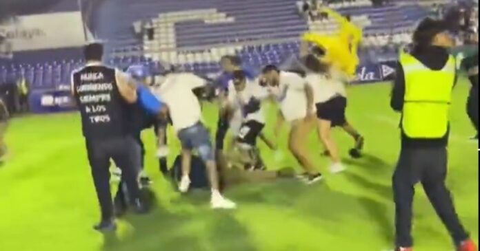 A punta de pistola, sillazos y golpes, termino el partido del #CELAYA, en la cancha hubo trifulca cuando un guardia de seguridad tuvo un altercado con un reportero y aficionados se metieron a la cancha a golpear al elemento de seguridad privada @LigaMXExpansion @DavidFaitelson_ pic.twitter.com/pAkPCwjMd0 — Primer Plano (@PrimerPlanoInfo) April 27, 2025