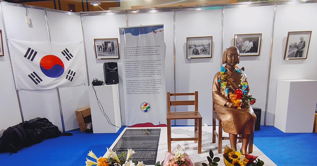 La estatua en homenaje a las mujeres víctimas de esclavitud sexual, en su mayoría coreanas, está instalada en un stand de la Feria Internacional del Libro de Buenos Aires