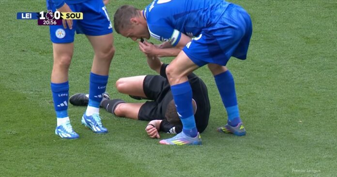 Sin embargo, lo más insólito no fue lo que sucedió con el juez de 49 años, sino la reacción del capitán de los Foxes, el legendario Jamie Vardy: tomó el silbato de Webb mientras estaba tirado en el piso y empezó a hacerlo sonar para que detener las acciones, en una imagen que rápidamente se transformó en viral.