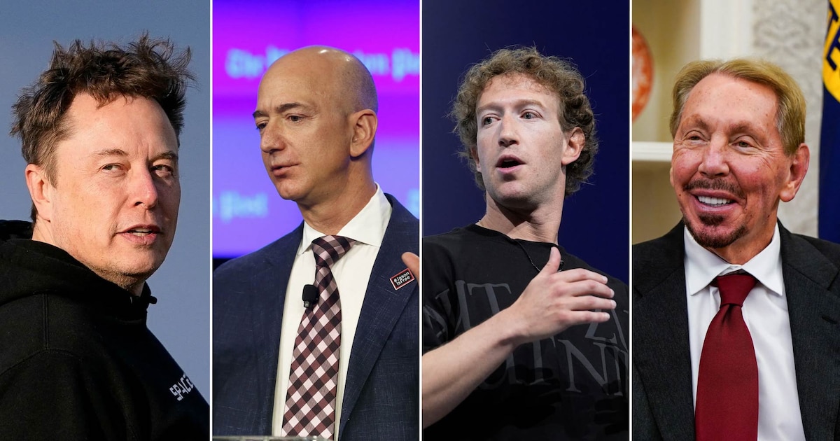 Elon Musk – USD 386.500 millones (Tesla, SpaceX, xAI) Jeff Bezos – USD 201.600 millones (Amazon) Mark Zuckerberg – USD 190.000 millones (Meta) Larry Ellison – USD 176.900 millones (Oracle) Warren Buffett – USD 166.400 millones (Berkshire Hathaway) Bernard Arnault – USD 146.500 millones (LVMH) Larry Page – USD 132.700 millones (Google) Sergey Brin – USD 127.200 millones (Google) Amancio Ortega – USD 114.400 millones (Inditex) Steve Ballmer – USD 114.100 millones (Microsoft, Los Angeles Clippers)