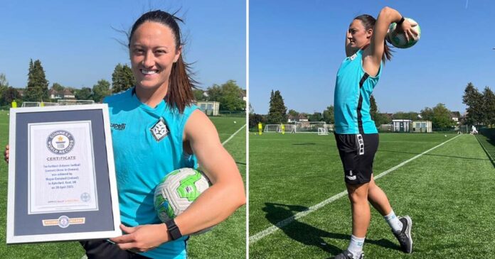 En su web oficial, el libro de Récords Mundiales Guinness informó: “El saque de banda de fútbol (femenino) más lejano fue de 37,55 m (123 pies 2 pulgadas) y lo logró Megan Campbell (Irlanda) en Aylesford, Kent, Reino Unido, el 30 de abril de 2025. El récord se intentó en el campo de entrenamiento de las London City Lionesses. Campbell es una futbolista internacional con más de 50 partidos internacionales con Irlanda”.
