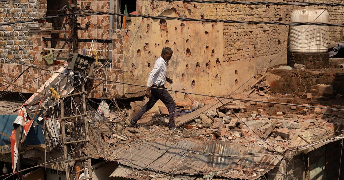 Residentes revisan los daños en un edificio causados por un supuesto ataque con misiles de la India, cerca de Muzaffarabad, el miércoles 7 de mayo de 2025, en la capital de Cachemira, bajo control de Pakistán. (AP Foto/M.D. Mughal)