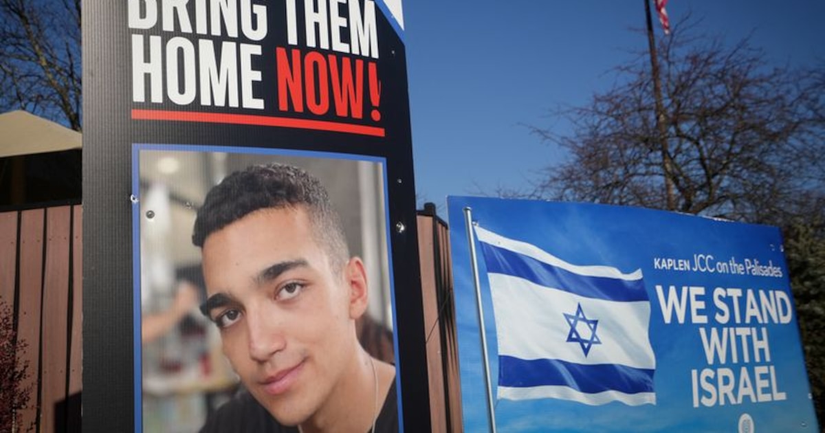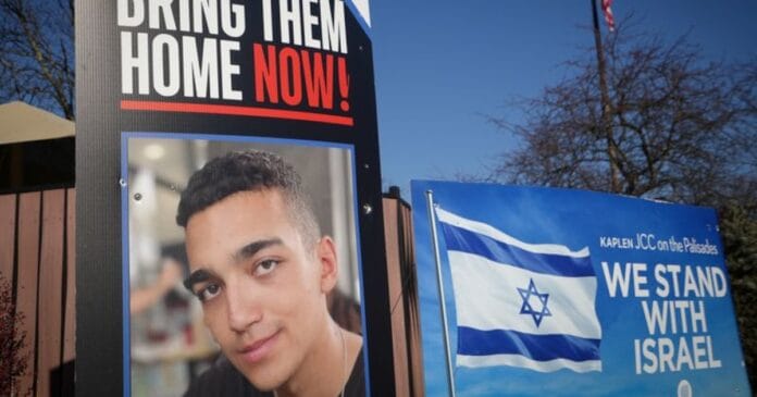 FOTO DE ARCHIVO. Carteles y una fotografía de Edan Alexander, el soldado estadounidense-israelí afuera de un centro comunitario judío en la ciudad natal de Alexander, Tenafly, Nueva Jersey, EEUU, el 14 de diciembre de 2024 (REUTERS/Stephani Spindel)