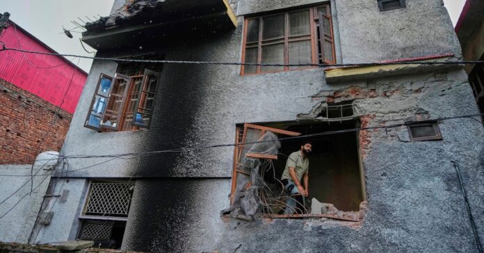 Un hombre camina por el tejado de una casa dañada en un ataque paquistaní en Rehari, Jammu. 10 mayo 2025. REUTERS/Adnan Abidi