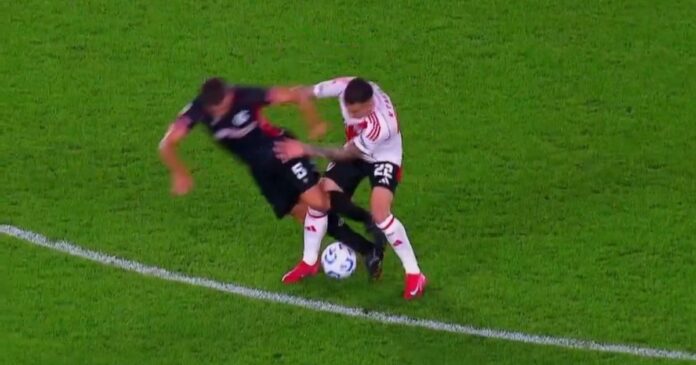 Ocurrió sobre el círculo central del campo de juego. Barracas salía jugando desde el fondo con Jonathan Rak, quien le pasa la pelota a Dardo Miloc. El #5 del Guapo recibió el balón de espaldas cuando, el colombiano Castaño, se acercó a marcarlo y le roba la pelota de espaldas. Luego, la jugada continúa con intervención de Driussi, quien se la cede a Bustos e ingresa por el sector derecho del área para marcar el gol que no fue.
