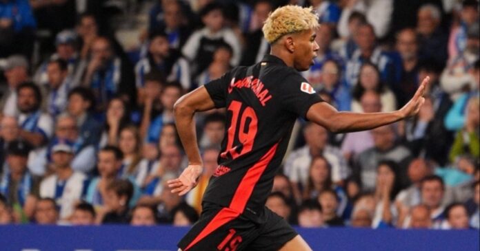 A los 8 minutos, Lamine Yamal anotó el primer gol del partido. El extremo derecho realizó una espectacular jugada individual que terminó con un zurdazo que descolocó al arquero Joan García Pons.