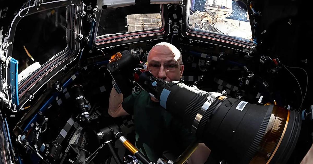 A veces instala cinco cámaras a la vez en el módulo cúpula de la estación espacial, donde siete ventanas ofrecen vistas panorámicas del espacio y la Tierra.