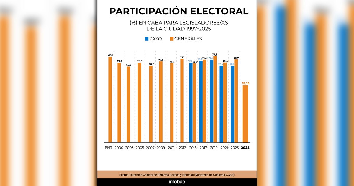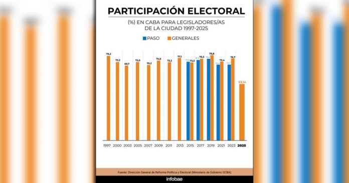 Los datos de otros años reflejan que en las generales para el cargo de diputados de la ciudad, en CABA la participación fue del 73% en 2015, del 76,5% en 2017; el 79,8% en 2019; el 73,4% en 2021 y 76,7% en 2023.