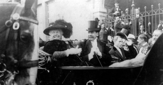 Del brazo del presidente argentino Figueroa Alacorta. Ya se habían celebrado elecciones y en octubre entregaría el poder a Roque Sáenz Peña (Archivo General de la Nación)