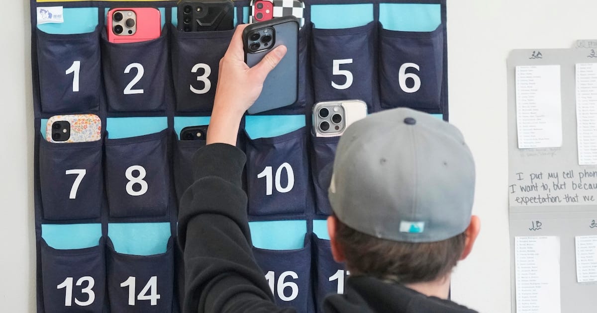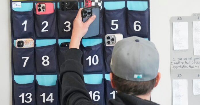 Una estudiante de noveno grado coloca su teléfono en un organizador mientras entra a un aula de la Escuela Secundaria Delta, el viernes 23 de febrero de 2024, en Delta, Utah. (AP Foto/Rick Bowmer)