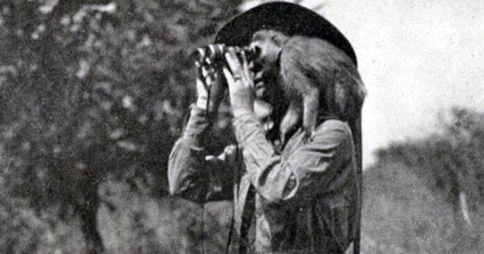 Delia Akeley con un monito sobre el hombro mientras explora con un largavistas