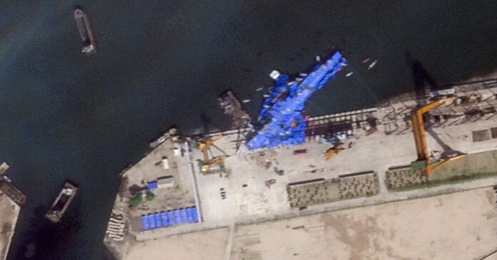 Una imagen satelital muestra un buque de guerra norcoreano cubierto con una lona azul tras un accidente ocurrido durante su botadura en el astillero de Chongjin, Corea del Norte, el 23 de mayo de 2025. 2025 Planet Labs PBC/Folleto vía REUTERS