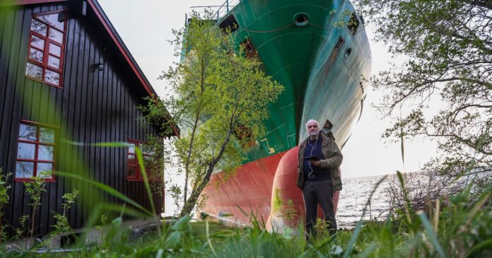 Johan Helberg se ve junto a su casa, con el buque portacontenedores NCL Salten al fondo, después de que el carguero de 135 metros se quedara encallado en Trondheimsfjord, a las afueras de Byneset, en Trondheim, Noruega el jueves 22 de mayo de 2025. (Jan Langhaug/NTB Scanpix via AP)