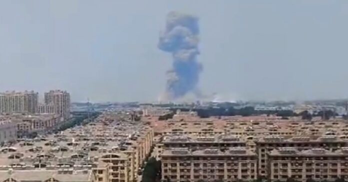 Videos difundidos por el periódico pekinés Xinjingbao mostraron una gigantesca columna de humo gris elevándose hacia el cielo, un incendio en una zona industrial y escaparates aparentemente destruidos por la explosión.