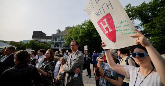 Con pancartas que decían “quien deba estar en clase hoy, que se quede”, los manifestantes expresaron su rechazo a la revocación del permiso de la universidad para participar en el programa federal de estudiantes y visitantes de intercambio, medida que afecta directamente a los estudiantes internacionales.