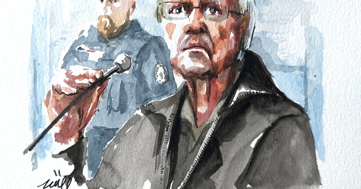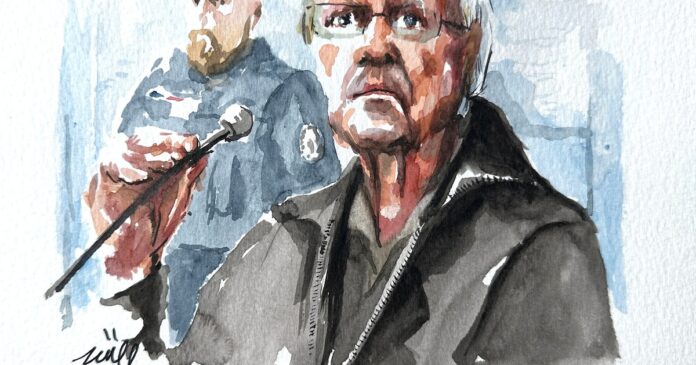 El excirujano francés Joel Le Scouarnec, acusado de violación y agresión sexual contra cientos de niños durante varias décadas, es visto durante su juicio en este boceto en el juzgado de Vannes, Francia, el 24 de febrero de 2025. REUTERS/ZZIIGG